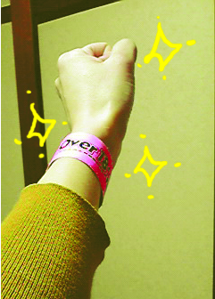 左腕にさんさんと輝く「18歳以上証明リストバンド」!!